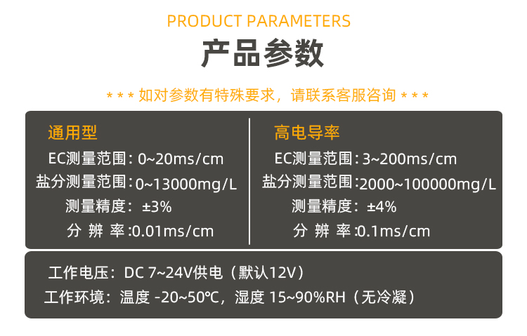 测量方法:电流电压2电极测量 EC值测量范围:0~0.2ms/cm,0~2ms/cm,0~20ms/cm(默认) 盐分测量范围: 0~100mg/L, 0~1100mg/L, 0~13000mg/L 测量精度:±3% 分辨率:0.01mS/cm(对应0~20ms/cm量程) 测量重复性:±1% 测量稳定时间:2秒 响应时间:<5秒 温度补偿:具备 | 测量方法:电流电压2电极测量 EC值测量范围: 3~200ms/cm 盐分测量范围: 2000~100000mg/L 海水盐分测量范围:10000~50000 mg/L或10~50 psu 测量精度:±4% 分辨率:0.1mS/cm(对应3~200ms/cm量程)或50mg/L 测量重复性:±1% 测量稳定时间:2秒 响应时间:<5秒 温度补偿:具备 |