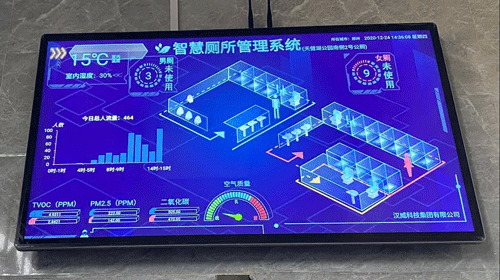 智慧公厕利用现代智能控制、传感传导等技术,将厕所布局、厕位使用情况、天气、时间、温度、湿度、空气质量等实时数据集中显示在入口的显示屏上,为每一个市民提供厕所使用信息和常规便民信息。